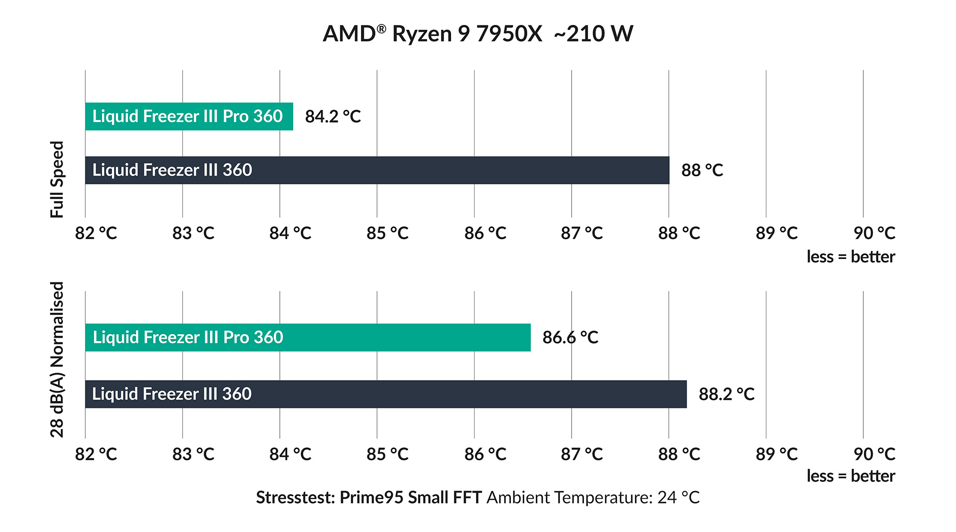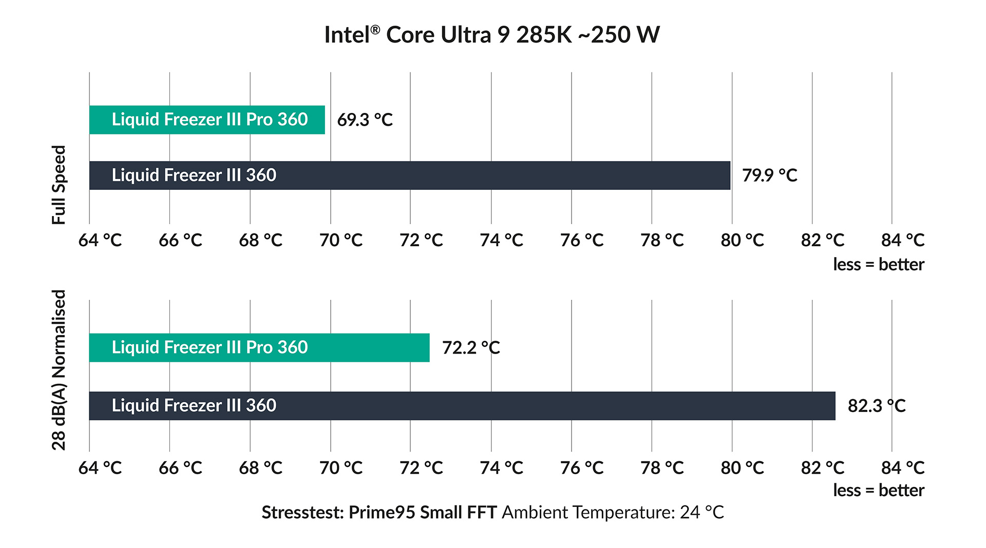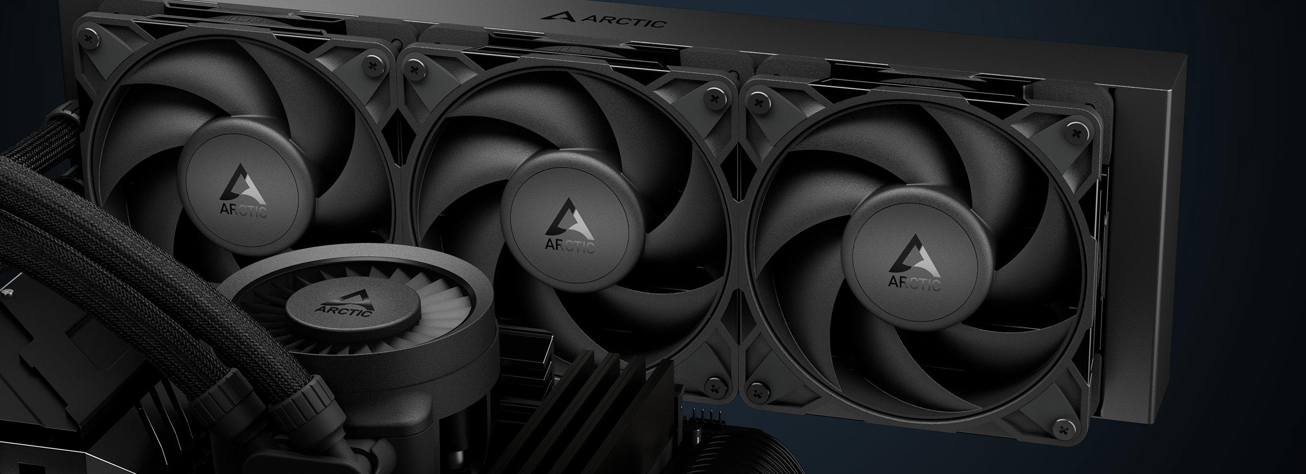General Specifications Compatibillity Intel® LGA1851, LGA1700 AMD® AM5, AM4 TIM MX-6 (0.8 g) Warranty 6 Years Operating Ambient Temperature 0–40 °C Weight 2020g Pump 800–2800 rpm (PWM controlled) Current | Voltage 0.35 A | 12 V DC Cold Plate Copper, Micro Skived Fins Tube Length 450 mm Tube Diameter Outer: 12.4 mm Inner: 6.0 mm Radiator Material Aluminium Dimensions 398 (L) x 120 (W) x 38 (H) mm VRM Module VRM Fan 400–2500 rpm (PWM controlled) Current | Voltage 0.05 A | 12 V DC General 3 x P12 Pro Speed 600–3000 rpm Airflow 77 cfm | 131 m³/h Static Pressure 6.9 mmH20 Bearing Fluid Dynamic Bearing Current | Voltage 0.33 A | 12 V DC Connector 4-Pin Fan Plug