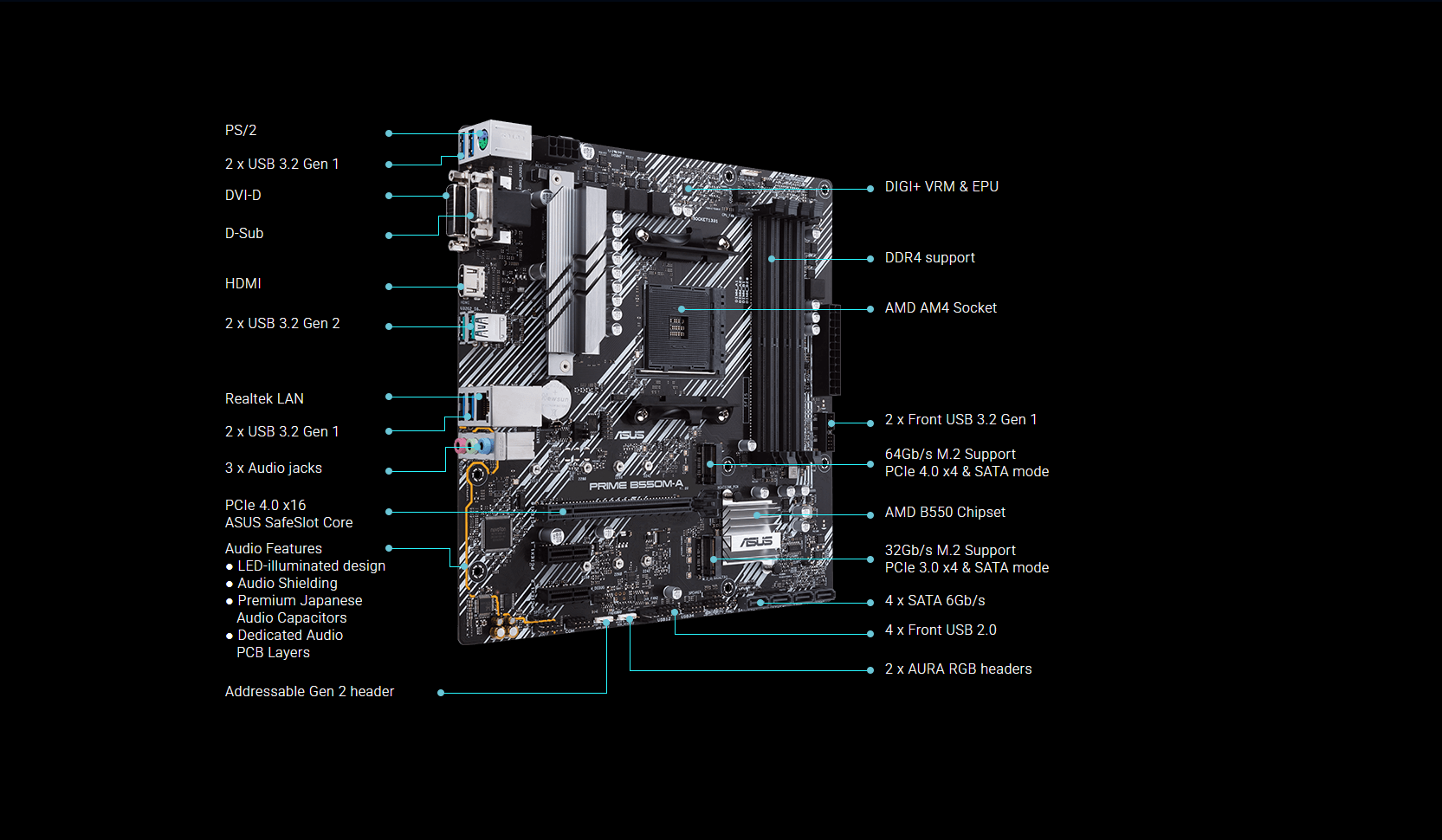 AMD AM4 socket: Ready for 3rd Gen AMD Ryzen™ Processors Comprehensive cooling: VRM heatsink, PCH heatsink, and Fan Xpert 2+ Ultrafast connectivity: Dual M.2, PCIe 4.0, 1 Gb Ethernet, USB 3.2 Gen 2 Type-A Aura Sync RGB: Onboard addressable Gen 2 header for RGB LED strips, easily synced with Aura Sync-capable hardware