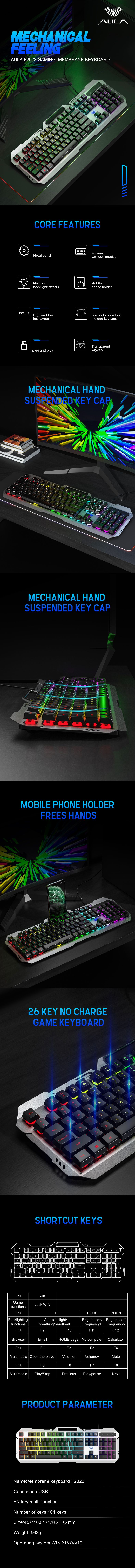 Keyboard specifications Model: AULA F2023 Key type: Membrane with suspended keycaps Number of keys: 104 keys, full-size layout Connectivity: Wired USB Anti-ghosting: 26-key rollover Backlight: Rainbow RGB, with 3 effects that can be adjusted for brightness and speed Multimedia keys: 8 function keys (FN+F1 to FN+F8) for media controls Special features: IP68 waterproof protection Win key lock function Includes a keycap puller Construction: Brushed aluminum alloy panel Dimensions: 457.82 x 160.17 x 28.82 mm Weight: 562g Mouse specifications Model: AULA F2023 Number of keys: 6 keys Tracking method: Optical DPI levels: 4 adjustable settings—800, 1200, 1600, and 2400 DPI. Note: One retailer lists the highest DPI at 3600. Backlight: RGB breathing light Design: Ergonomic and skin-friendly Polling rate: 125Hz Connectivity: Wired USB Dimensions: 124(L) x 64(W) x 40(H) mm Weight: 115g