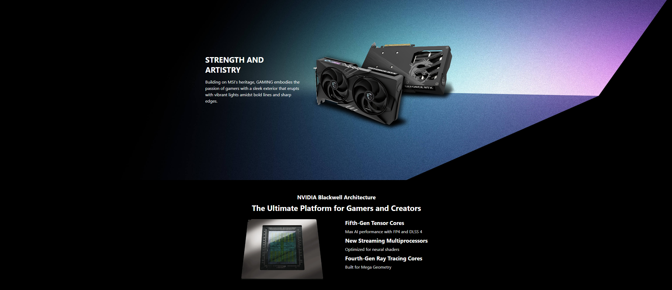 Powered by the NVIDIA Blackwell architecture and DLSS 4 Core Clocks: Extreme Performance: 2640 MHz (MSI Center) Boost: 2625 MHz TWIN FROZR 10: Experience superior cooling and quieter performance with MSI's enhanced fan blade design. STORMFORCE Fan: Seven fan blades, claw texturing, and a circular arc are designed for optimal airflow with minimal noise. Nickel-plated Copper Baseplate: Heat from the GPU and memory is swiftly captured by a nickel-plated copper baseplate and transferred. Core Pipes feature a square design to maximize contact with the GPU baseplate for optimal thermal management. Metal Backplate: A reinforcing metal backplate with airflow vents and thermal pads enhances cooling. WAVE-CURVED 3.0: Additional efficiency is gained by adjusting the size of the wave edges under the fan motor and other spots where there is less airflow. MSI Center: The exclusive MSI Center software lets you monitor, tweak and optimize MSI products in real-time. Afterburner software takes full control with the most recognized and widely used graphics card overclocking software in the world