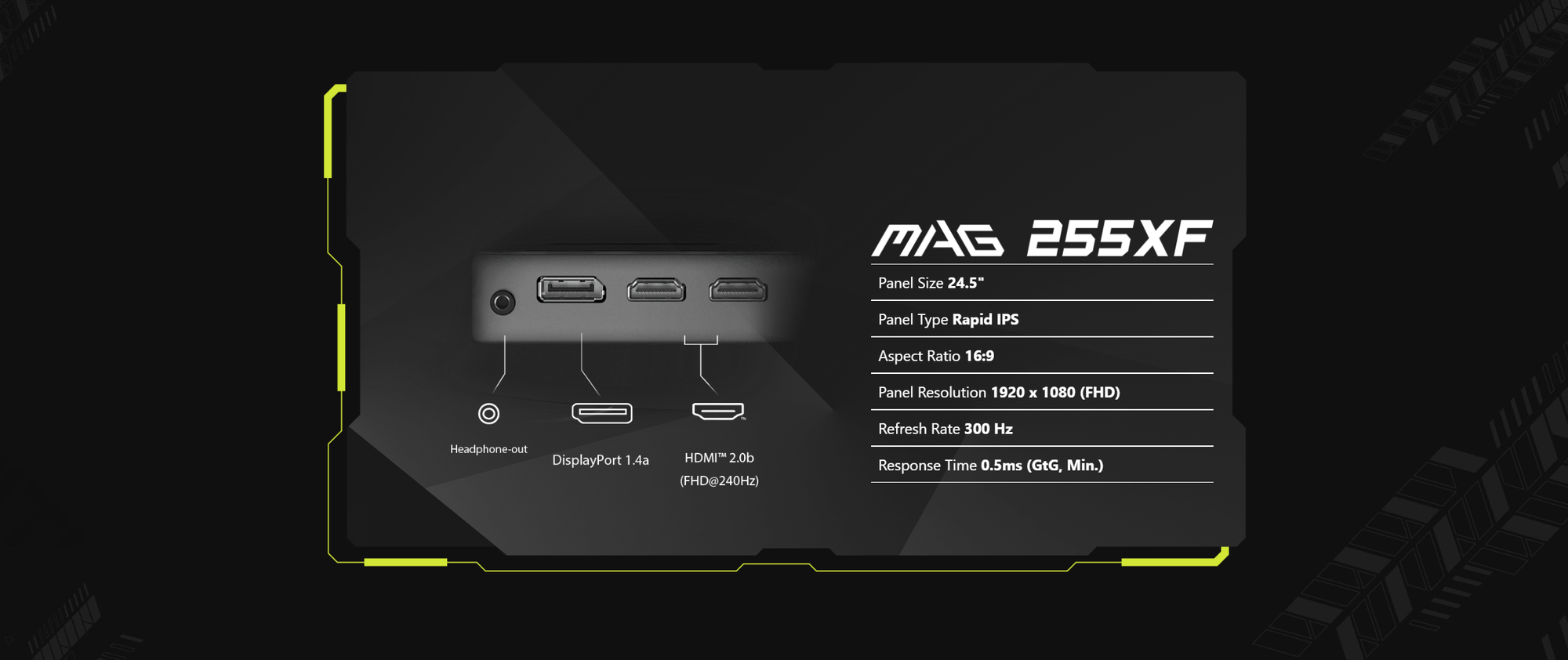 Specifications: Panel Size: 24.5" (62.23 cm) Resolution: 1920 × 1080 (Full HD) Panel Type: Rapid IPS Refresh Rate: 300Hz Response Time: 0.5ms (GtG, Min.) Brightness: 250 nits (Typical) Contrast Ratio: 1000:1 (Static), 100,000,000:1 (DCR) Color Gamut: 87% Adobe RGB / 90% DCI-P3 / 120% sRGB Display Colors: 1.07 Billion (8-bit + FRC) Viewing Angle: 178° (H) / 178° (V) Curvature: Flat Aspect Ratio: 16:9 Surface: Anti-glare Connectivity: DisplayPort 1.4a: 1920×1080 @ 300Hz 2 × HDMI 2.0b: 1920×1080 @ 240Hz 1 × Headphone-Out Power: Input: 100–240V, 50/60Hz Power Type: Internal Power Board Dimensions & Weight: With Stand: 557.1 × 220.1 × 418.5 mm Without Stand: 557.1 × 66.4 × 326.9 mm Carton: 630 × 125 × 411 mm Weight (Net / Gross): 3.24 kg / 5.13 kg Warranty : 3 Years
