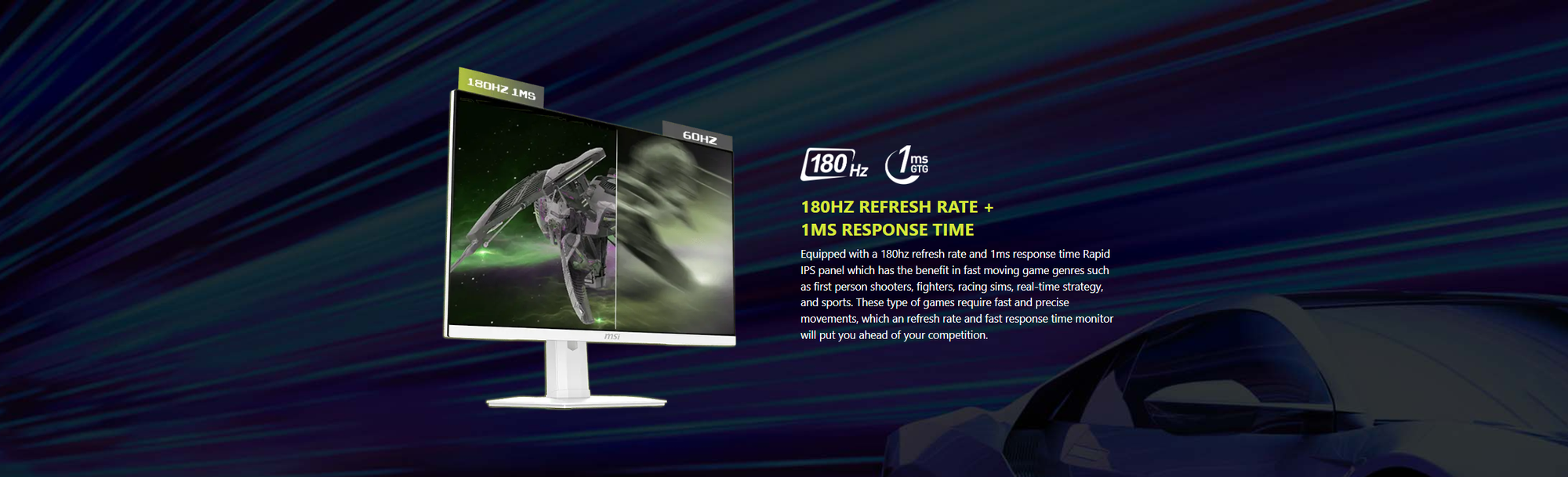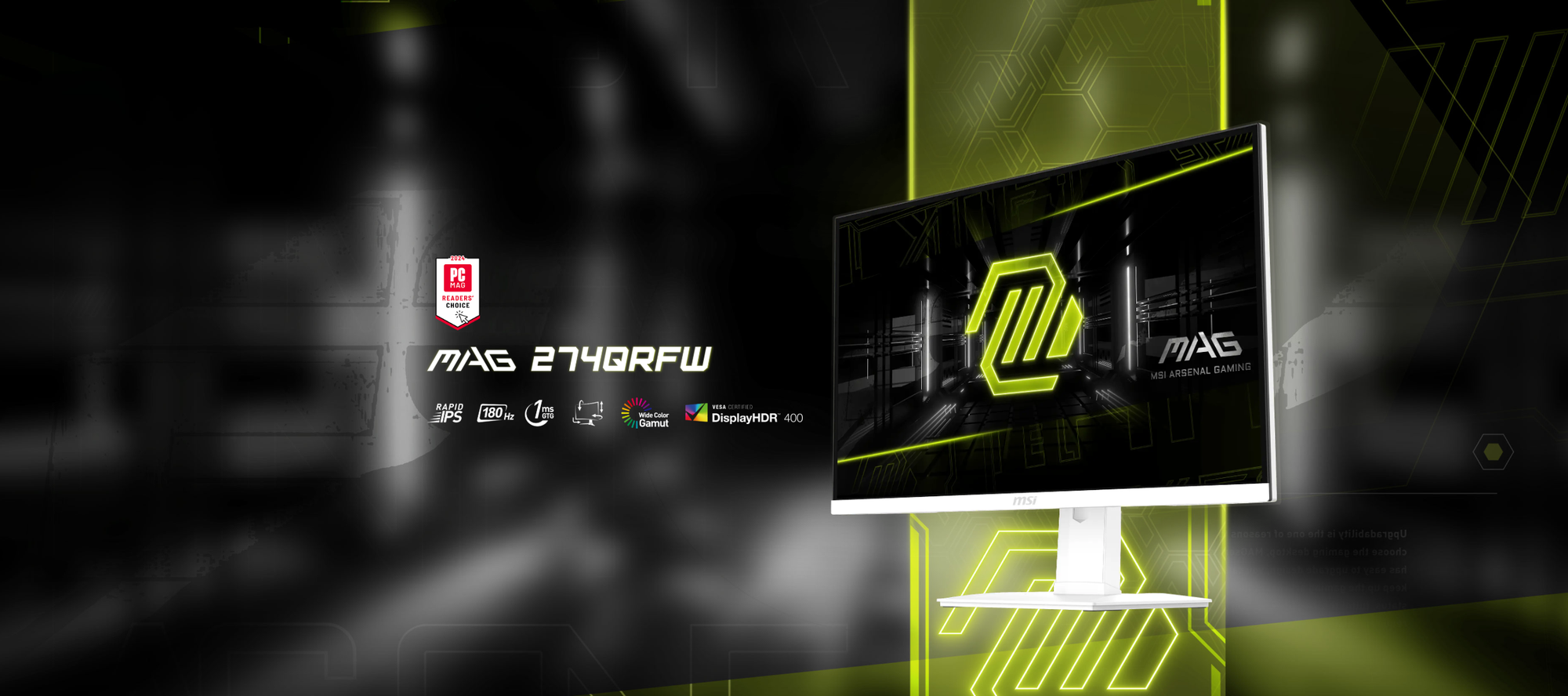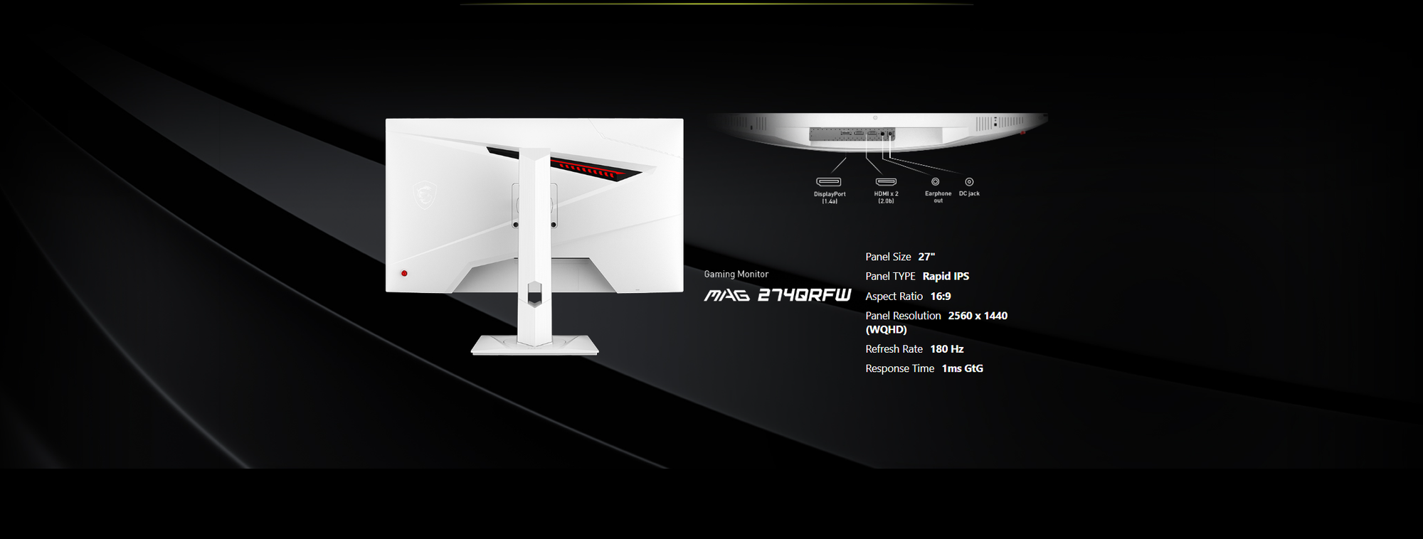 Panel Size: 27" (69 cm) Active Display Area: 596.736(H) x 335.664(V) mm Curvature: Flat Panel Type: Rapid IPS Panel Resolution: 2560 x 1440 (WQHD) Pixel Pitch (H x V): 0.2331 x 0.2331 mm Aspect Ratio: 16:9 Brightness: 400 nits (Typ.) Contrast Ratio: 1000:1 (Typ.) Dynamic Contrast Ratio (DCR): 100,000,000:1 Signal Frequency: 64.56~266.4 KHz(H) / 48~180 Hz(V) Activated Range / Refresh Rate: 48~180Hz (Max 180Hz) Response Time: 1ms (GTG) Dynamic Refresh Rate Technology: AMD FreeSync™ HDR Support: VESA DisplayHDR 400 Video Ports: 1 x DisplayPort 1.4a (Up to 2560x1440 @ 180Hz) 2 x HDMI™ 2.0b (Up to 2560x1440 @ 144Hz) Audio Ports: 1 x Headphone Out Viewing Angle: 178° (H) / 178° (V) Color Coverage: 93% Adobe RGB / 95% DCI-P3 / 123% sRGB Surface Treatment: Anti-glare Display Colors: 1.07B (10 bits / 8 bits + FRC) Frameless Design: Yes PIP / PBP Function: Yes Power Type: External Adaptor 19V 2.58A Power Input: 100 ~ 240V, 50/60Hz Warranty : 3 Years
