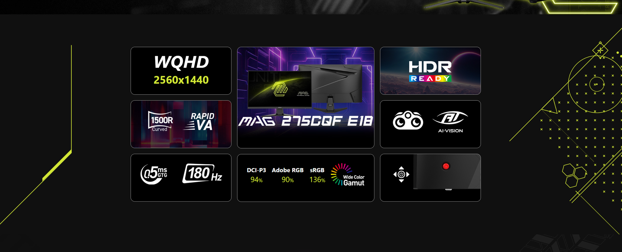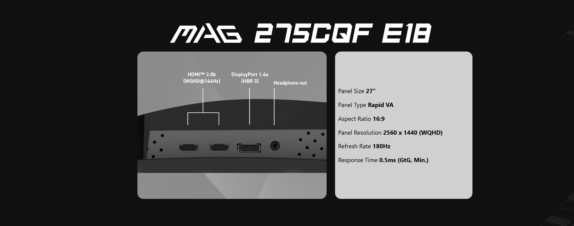 Key Specifications: Panel Size: 27" Active Display Area: 596.736mm × 335.664mm Curvature: 1500R Panel Type: Rapid VA Resolution: 2560 × 1440 (WQHD) Pixel Pitch: 0.2331mm × 0.2331mm Aspect Ratio: 16:9 Brightness: SDR 250 cd/m² Contrast Ratio: 5000:1 Dynamic Contrast Ratio (DCR): 100,000,000:1 Signal Frequency: 73.86–251.74 kHz (H) / 48–180 Hz (V) Refresh Rate: 180Hz Response Time: 0.5ms (GtG, Min) Dynamic Refresh Rate Technology: AMD FreeSync™ HDR Support: HDR Ready Connectivity: 2 × HDMI™ 2.0b (WQHD @ 144Hz) 1 × DisplayPort 1.4a (HBR3) 1 × Headphone-out HDMI™ CEC Supported VRR Supported for PS5 and Xbox Color & Display: Viewing Angle: 178° (H) / 178° (V) Color Gamut: 90% Adobe RGB / 94% DCI-P3 / 136% sRGB (CIE1976 Standard) Surface Treatment: Anti-glare Display Colors: 1.07b, 10-bit (8-bit + FRC) Design & Features: Console Mode: Supported (1080p: 60Hz & 120Hz; 1440p: 60Hz & 120Hz) Frameless Design: Yes Power Type: Internal Power Board Power Input: 100–240V, 50/60Hz Tilt Adjustment: -5° to 20° Kensington Lock: Yes VESA Mounting: 100 × 100 mm Dimensions & Weight: With Stand: 611.5 × 249.7 × 439.1 mm (24.07 × 9.83 × 17.29 in) Without Stand: 611.5 × 101.8 × 366.1 mm (24.07 × 4.01 × 14.41 in) Net Weight: 4.6 kg (10.14 lbs) Gross Weight: 6.85 kg (15.1 lbs) Carton Dimensions: 686 × 157 × 442 mm (27.01 × 6.18 × 17.4 in) Included Accessories: 1 × DisplayPort Cable (1.4a) 1 × Power Cord (C13) 1 × Quick Guide Warranty : 3 Years