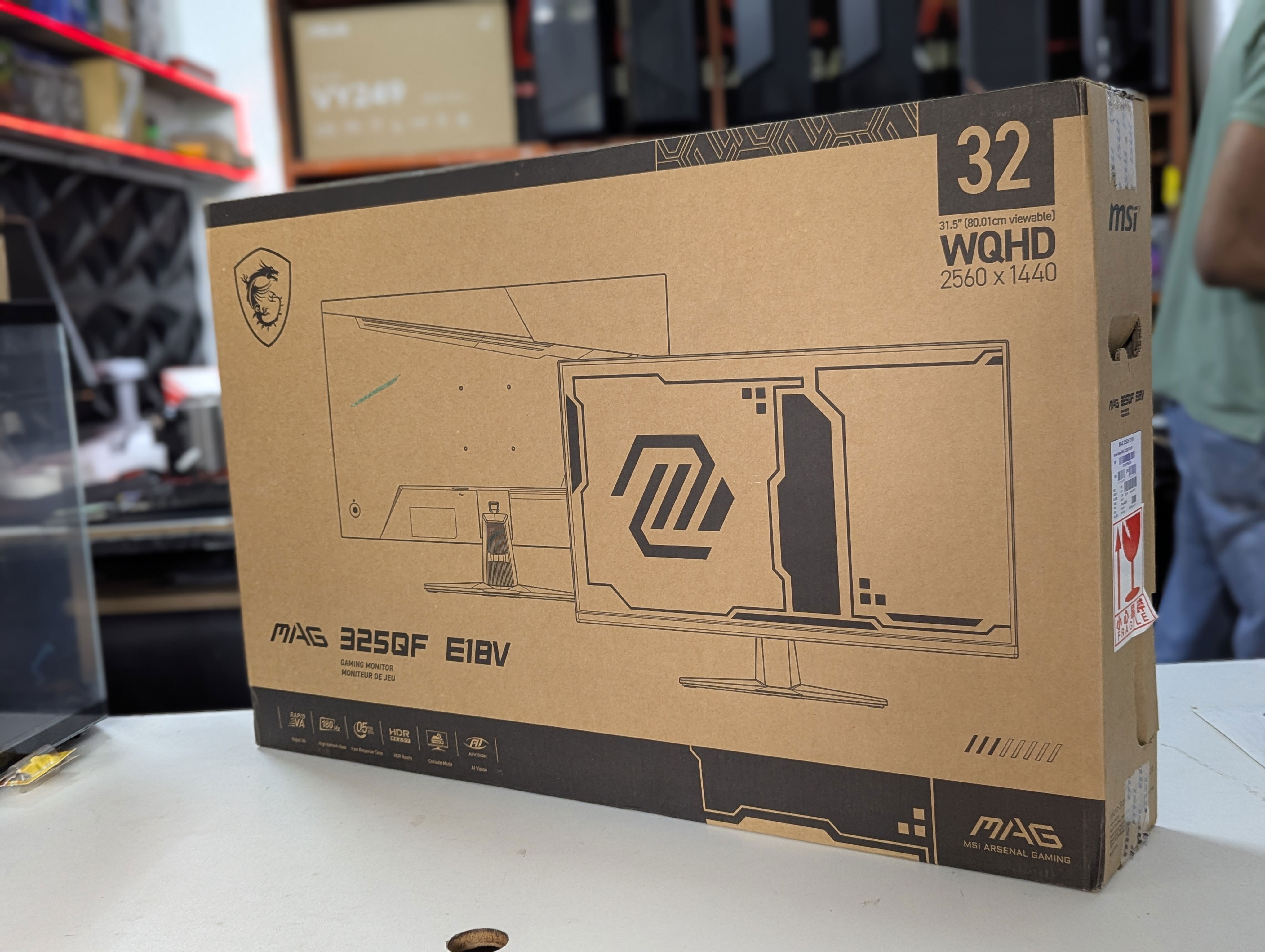 Experience immersive gaming with the MAG 325QF E18V gaming monitor. It features a 2560x1440 (WQHD) panel, a 180Hz refresh rate, and a rapid 0.5ms (GtG, Min) response time. The monitor is HDR Ready, enhancing eye-catching details through adjustments in contrast and shadows. Designed for competitive FPS, first-person RPG/MMORPG, and flight/racing simulator genres, the MSI MAG 325QF E18V gaming monitor takes casual gaming to a new level, challenging players to see beyond the game. Panel Size 31.5" Active Display Area (mm) 697.344 (H) x 392.256 (V) Curvature Flat Panel Type Rapid VA Panel Resolution 2560 x 1440 (WQHD) Pixel Pitch (H x V) 0.2724 (H) x 0.2724 (V) Aspect Ratio 16:9 Brightness (nits) SDR: 300 cd/m² Contrast Ratio 3500:1 DCR 100000000:1 Signal Frequency 71~266KHz (H) / 48~180Hz (V) ACTIVATED RANGE 48~180Hz Refresh Rate 180Hz Response time 0.5ms (GtG, Min.) DYNAMIC REFRESH RATE TECHNOLOGY Adaptive-Sync HDR Support HDR Ready Video ports 2x HDMI™ 2.0b (WQHD@144Hz) 1x DisplayPort 1.4a (HBR3) USB ports N/A Audio ports 1x Headphone-out Viewing Angle 178° (H) / 178° (V) Adobe RGB / DCI-P3 / sRGB 85% / 84% / 109% (CIE1976 Standard) Surface Treatment Anti-glare Display Colors 1.07B, 10 bits (8 bits + FRC) SPEAKER N/A Console Mode Supported Resolution & Refresh Rate: 1080p: 60Hz and 120Hz 1440p: 60Hz and 120Hz HDMI™ CEC: Supported VRR: PS5 and Xbox Supported Power Type Internal Power Board Power Input 100~240V, 50/60Hz Adjustment (Tilt) -5°~20° Adjustment (Swivel) N/A Adjustment (Pivot) N/A Adjustment (Height) N/A Kensington Lock Yes