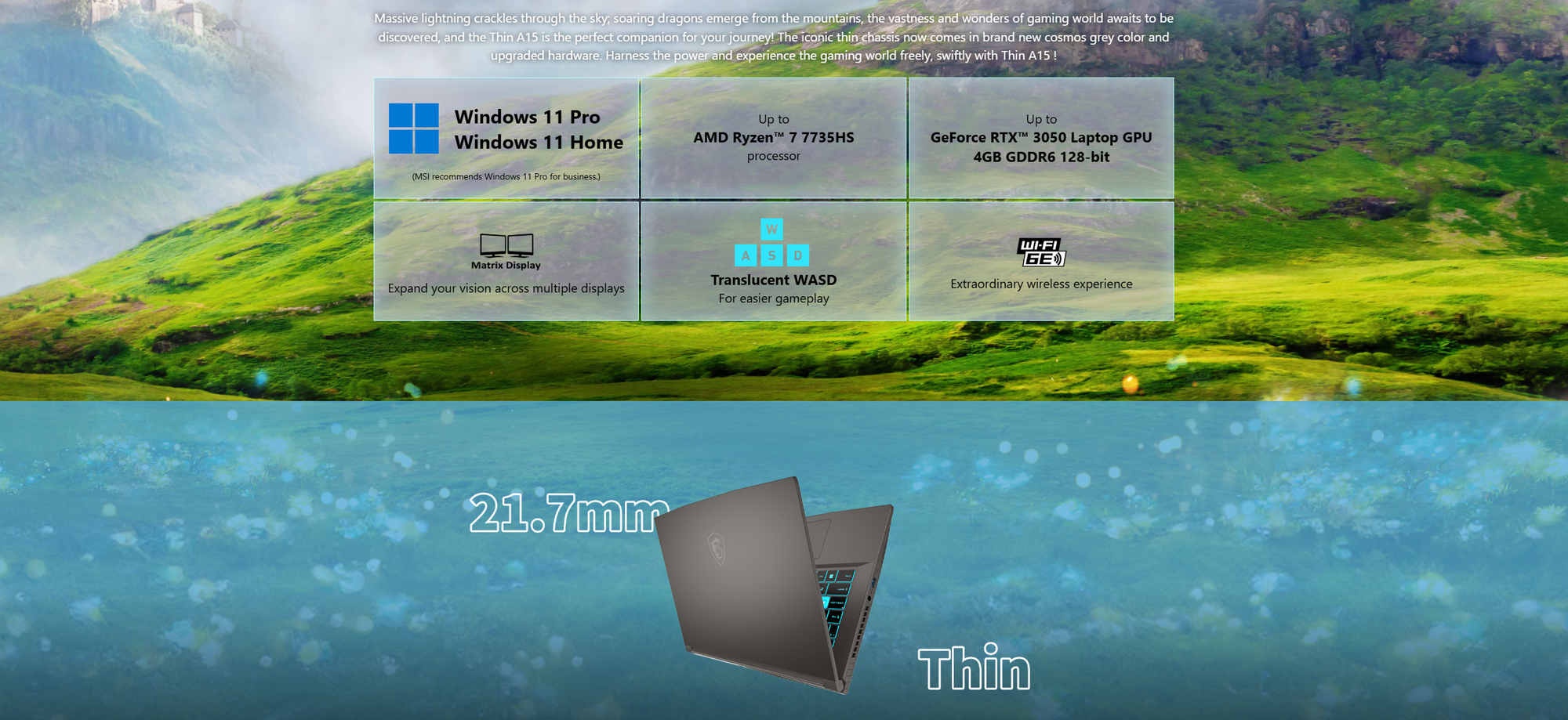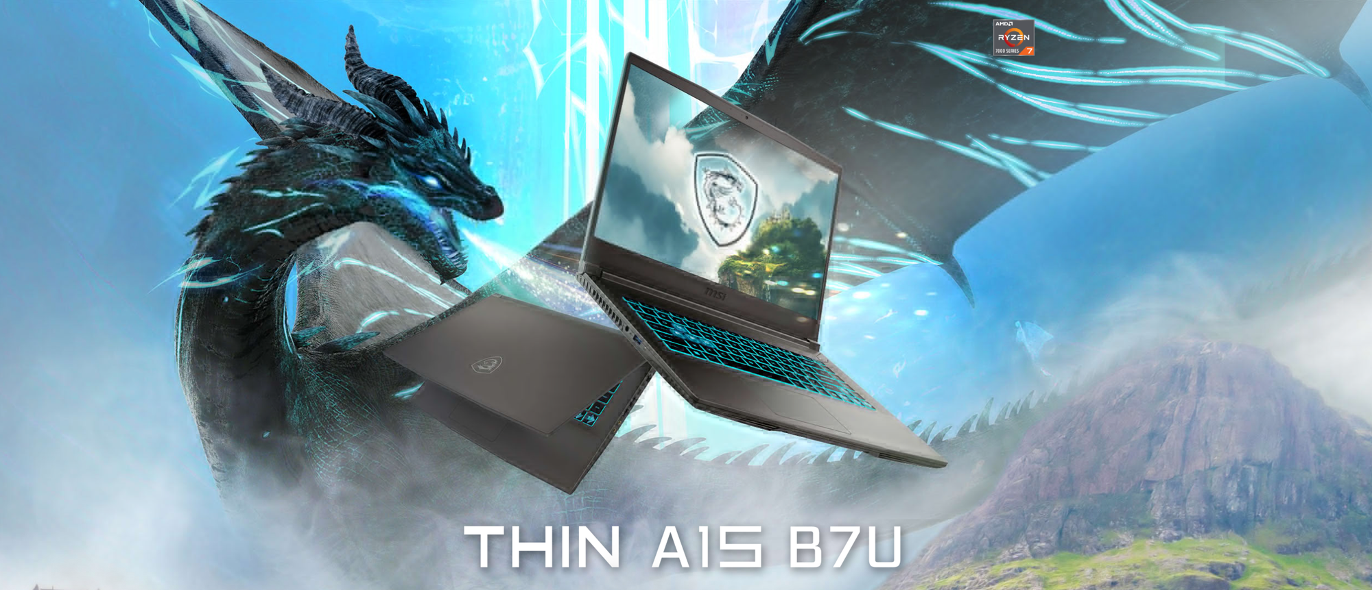 💻 MSI Thin A15 B7U 🔧 Key Specifications Processor: Up to AMD Ryzen™ 7 7000 HS-Series Graphics: Up to NVIDIA® GeForce RTX™ 3050 Laptop GPU 4GB GDDR6 (128-bit) Operating System: Windows 11 Home / Windows 11 Pro (Pro recommended for business) Display: 15.6" Full HD (1920×1080), 144Hz refresh rate, IPS-Level panel Matrix Display: Supports up to 2 additional displays via USB-C and HDMI™ Design: Thin bezel, aluminum aesthetics with asymmetric pattern Dimensions & Weight: 21.7mm thin, 1.86kg light Connectivity: Wi-Fi 6E for fast and stable streaming Audio: High-Resolution Audio ready Software: MSI Center for system customization; MSI App Player for seamless mobile-to-PC gaming experience