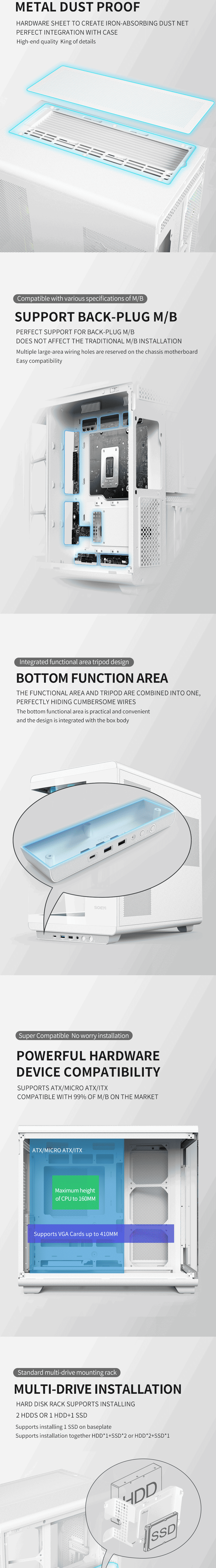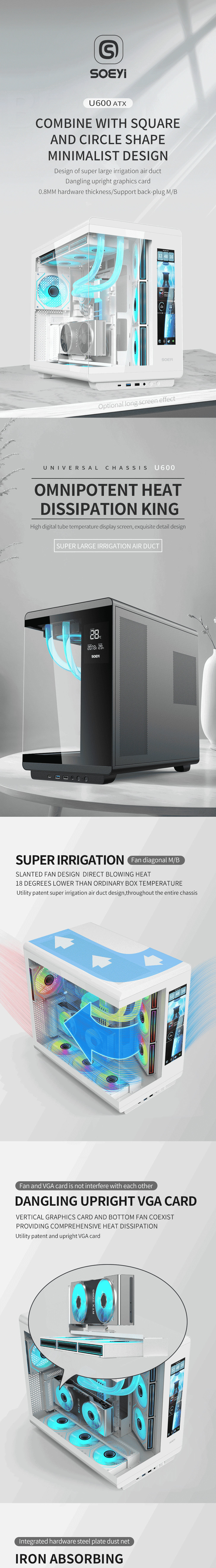 🖥️ Soeyi U600 Gaming PC Case ⚙️ Key Features Display Options: CH1+ Digital Display: Front-mounted digital screen shows real-time data for power consumption, frequency, and temperature. CH1L Large-Screen: Large LCD panel on the front offers a more immersive and customizable visual experience. Aesthetics: Panoramic "full view" design showcases your internal components with a sleek, modern style. High Compatibility: Supports ATX, Micro-ATX, and Mini-ITX motherboards for flexible PC builds. Extensive Cooling Support: Fans: Supports multiple fan configurations on the top, motherboard area, and bottom. Liquid Cooling: Accommodates up to a 360mm radiator on top. Flexible Hardware Support: GPU: Supports graphics cards up to 410mm in length, including vertical GPU mounting. CPU Cooler: Compatible with coolers up to 160mm in height. Power Supply: Supports standard ATX PSUs. Storage Options: Multiple bays for 3.5″ HDDs and 2.5″ SSDs, offering versatile storage combinations. Connectivity: Modern front I/O panel includes: 1 × USB Type-C 1 × USB 3.0 1 × USB 2.0 HD Audio & Microphone Jacks 📐 Dimensions & Material Case Size: 441 × 276 × 419 mm Expansion Slots: 7 PCI slots Material: 0.8mm SPCC steel ✨ Highlights Panoramic tempered glass design for maximum visibility Multiple display options for real-time monitoring or immersive visuals Supports large GPUs and high-performance cooling solutions Flexible fan and radiator configurations for custom airflow Modern connectivity with USB Type-C and audio jacks