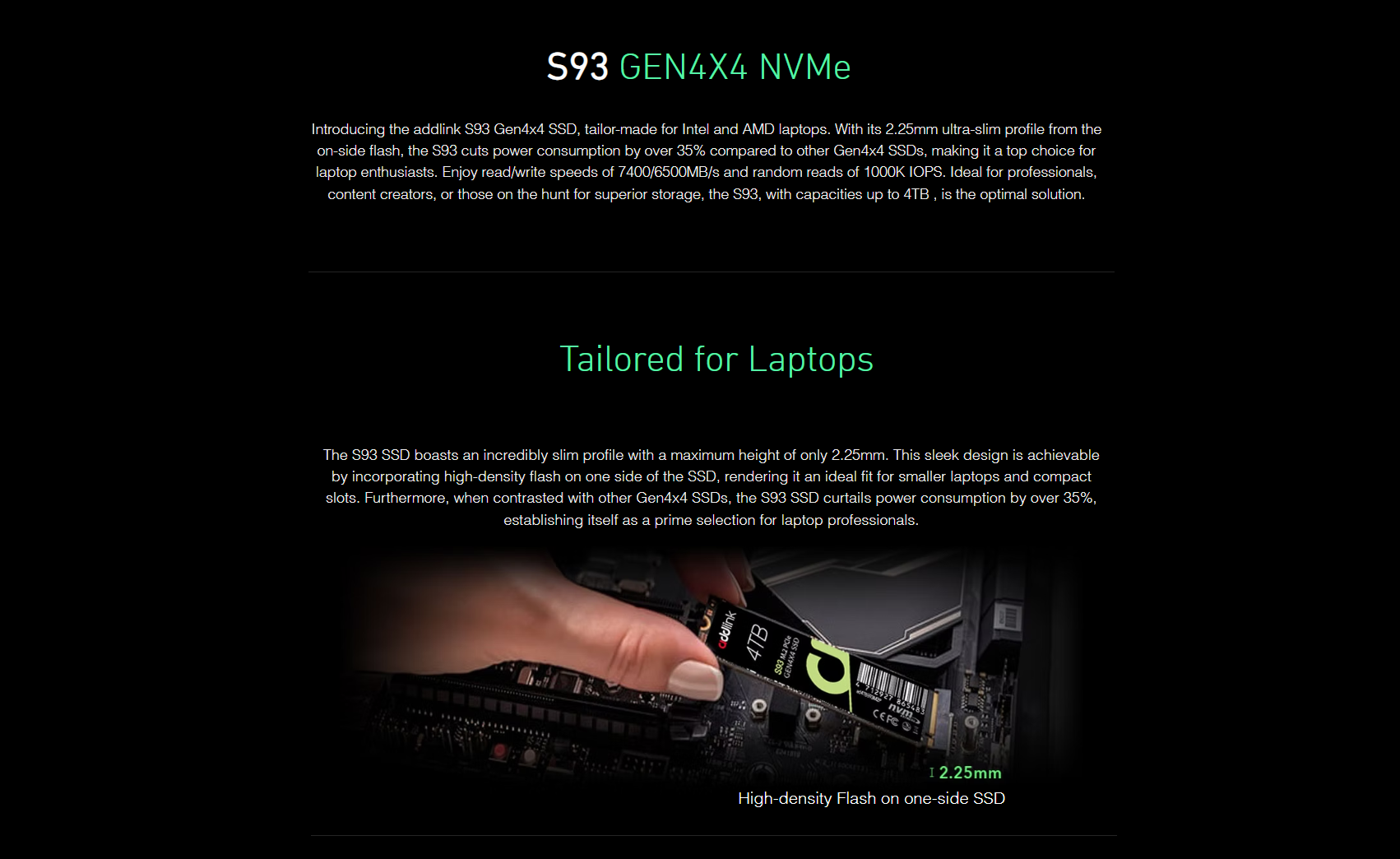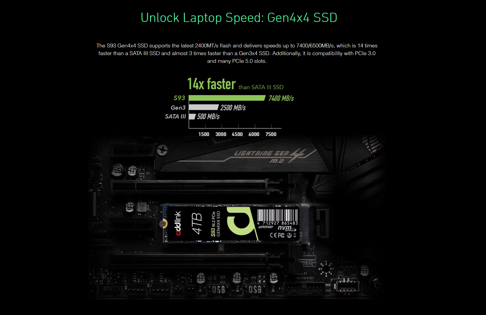 ⚡ Addlink S93 NVMe Gen4x4 SSD – 1TB Ultra-Performance ⭕Specifications: ✔️Brand: Addlink ✔️Model: S93 ✔️Interface: PCIe Gen4x4 NVMe 1.4 ✔️Form Factor: M.2 2280 ✔️Flash Type: 3D TLC NAND ✔️Capacity: 1TB ✔️Sequential Read Speed: Up to 7400 MB/s ✔️Sequential Write Speed: Up to 6000 MB/s ✔️MTBF: 1,800,000 hours ✔️Operating Temperature: 0°C – 70°C ⭕Warranty: 3 Years Limited